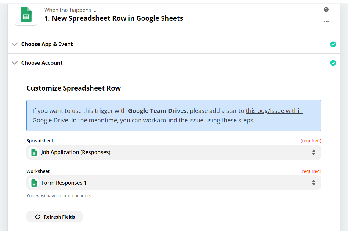 3. In first step to create zap, we've provided “Google Sheets” as input app and "New Spreadsheet Row" as trigger. Further also provided specific "Spreadsheet" and "Worksheet" to lookup on.