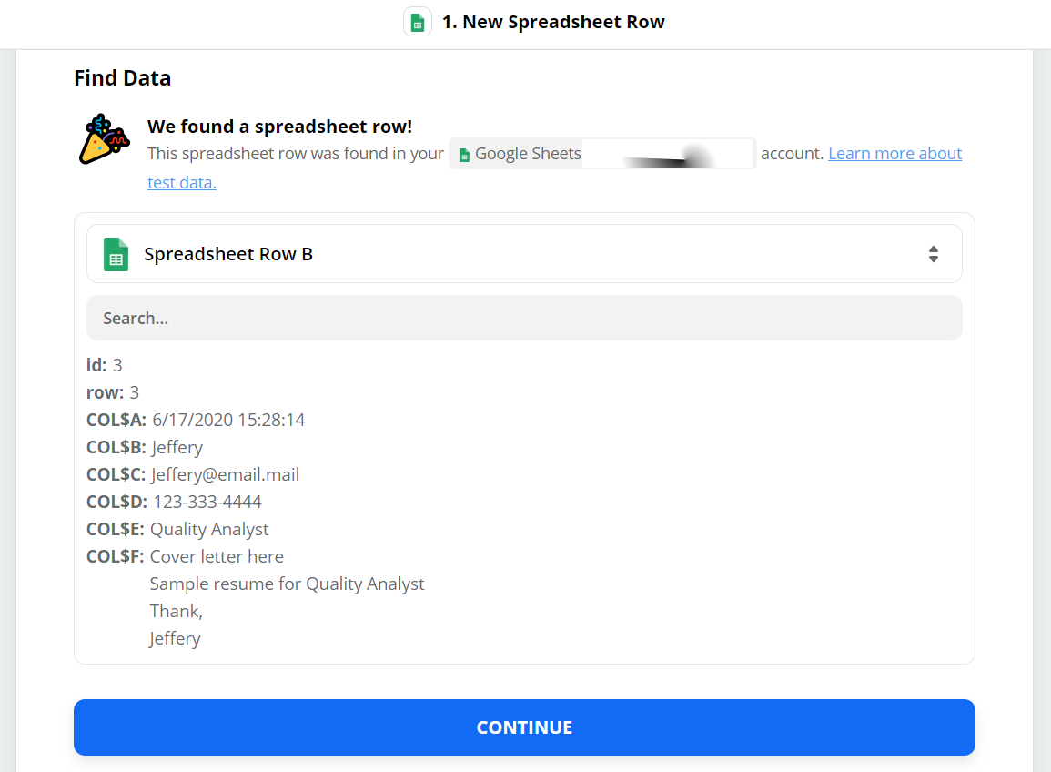 4. After all configuration is ready, it's time to test trigger and analyze output data. Prior to testing, do add new google form input. This will add new row in spreadsheet which we’ve configured as trigger for this zap. Data will look like below.